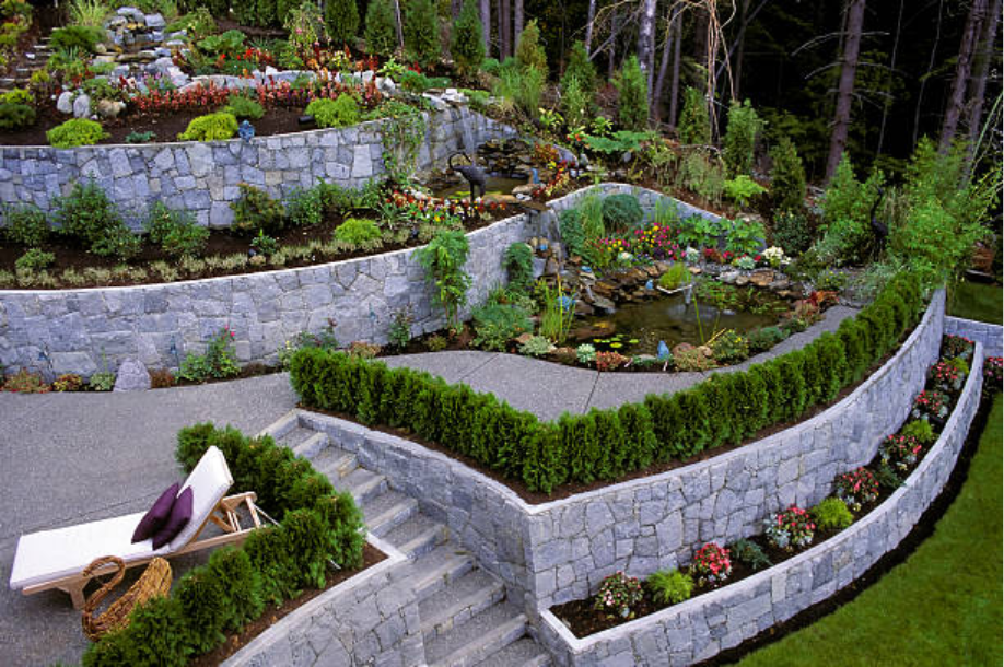 Timber retaining walls: Cost-effective, natural appearance, ideal for garden terraces and smaller slopes.